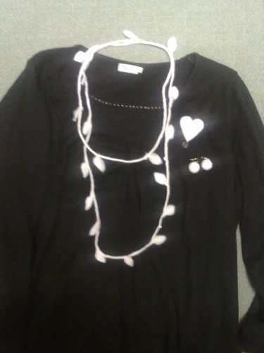 Mietin, että pusero kaipaisi vielä jotakin. Edellisissä juhlissa minulla oli tavalliset helmet kaulassa, ajattelin voisiko huovuttamalla saada aikaseksi jonkinlaisen kaulanauhan. Märkähuovutun ensin nauhan jonka sisälle laitoin puuvillalangan. Sen jälkeen levyhuovutin pari levyä josta leikkasin lehtiä. Lehdet kiinnitin neulahuovutukselle ja samalla pistelin lehtiin ruoteita. Kuvassa ei oikein näy, mutta ompelin vielä sinne tänne kristalleja.